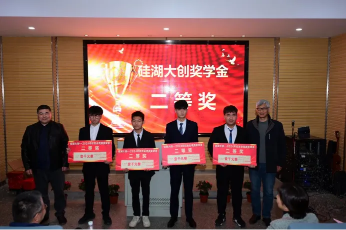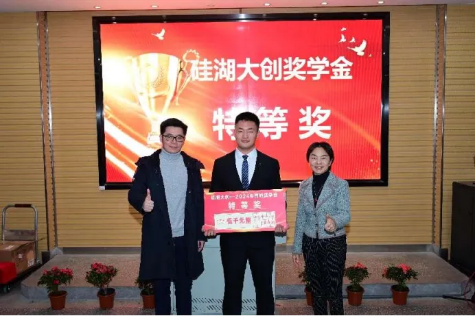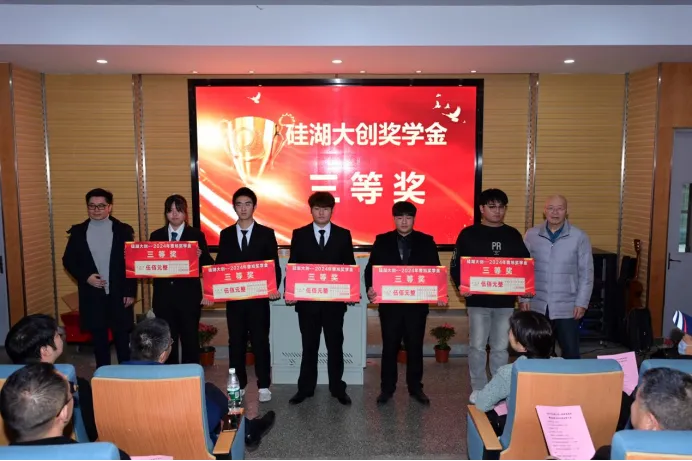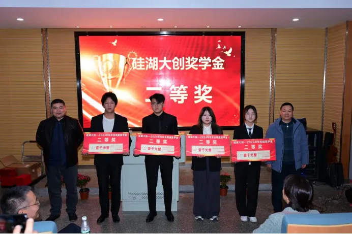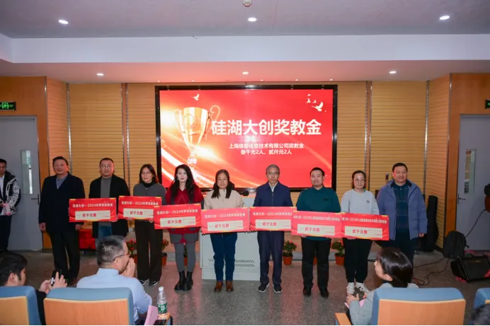 硅湖大创工程颁奖典礼圆满落幕,我们期待硅湖的师生们继续努力,开启新的辉煌篇章!特别感谢以下赞助者:资深投资人、上海添橙投资管理有限公司董事长张宏超先生慷慨赞助的一万元奖学金;聚宝盆(苏州)特种玻璃股份有限公司副董事长曹旭先生提供的一万元奖学金;硅湖职业技术学院校友总会捐赠的思源奖学金一万元;上海维服信息技术有限公司提供的奖教金一万元;以及我们的副校长罗纯教授的奖教金一万元。我们衷心感谢所有支持和帮助我校双创工作的企业家、校友、单位和个人,正是你们的助力,让更多的学子能在创新创业的征途上乘风破浪!