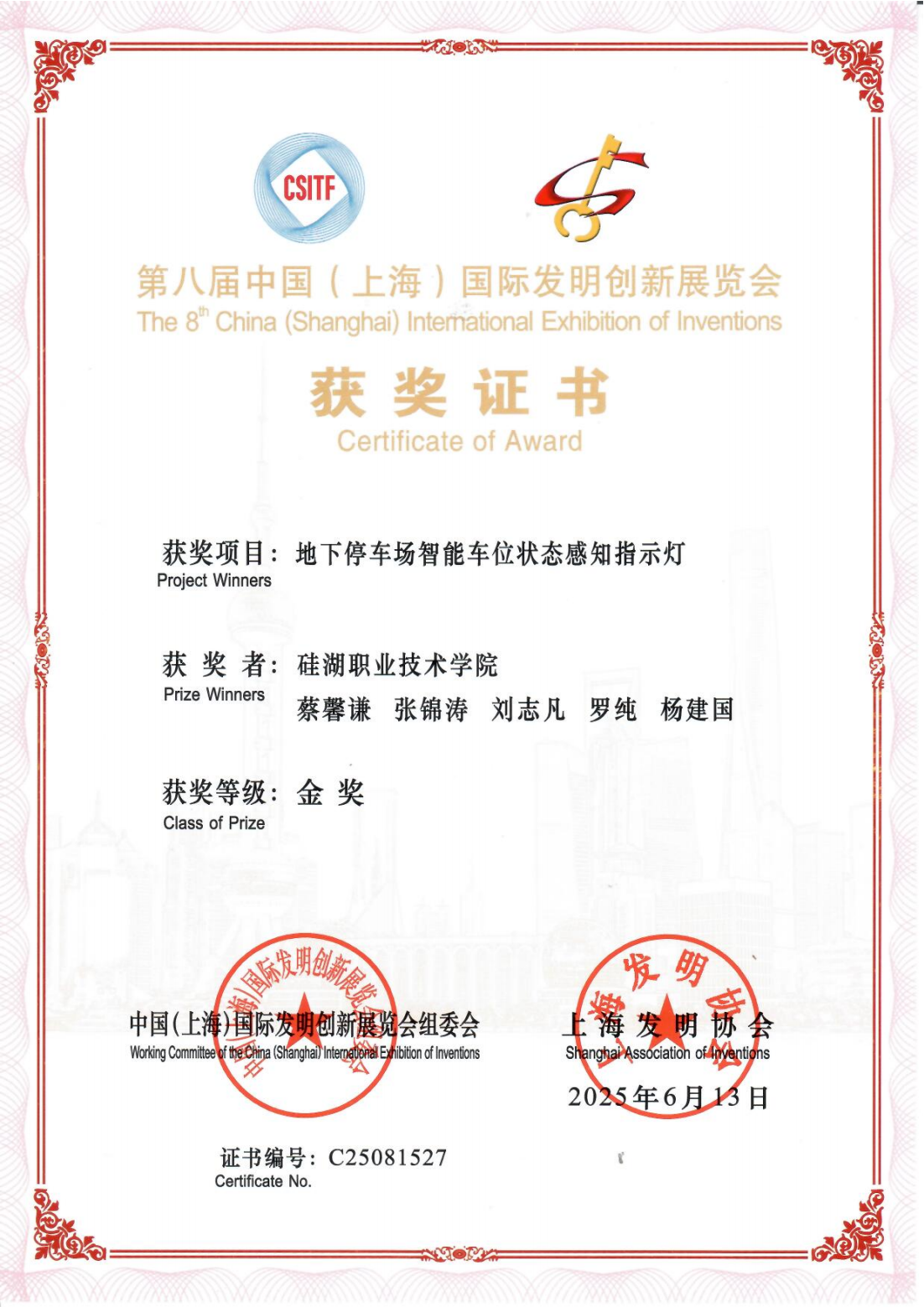 2025年6月13日,第八届中国(上海)国际发明创新展览会在上海世博展览馆盛大开幕。在展览会上,硅湖职业技术学院参展作品荣获金奖5项,银奖4项,为我校在此项赛事上再添佳绩,实现“硅湖大创”工程的新突破。