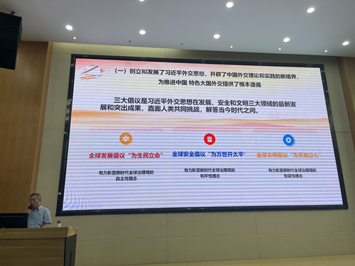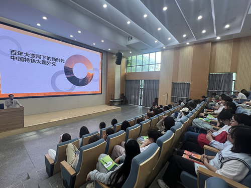 5月15日祁丛林副校长首先从历史的维度,讲解了中国特色大国外交形成和发展及中国特色大国外交的当代价值。随后从“百年未有之大变局”、“坚持习近平外交思想”、“坚持走和平发展道路”和“推动构建人类命运共同体”四个方面出发,深入分析了当今世界格局,世界不稳定因素产生的原因,向学生们系统阐述了习近平外交思想的丰富内涵,清晰说明了中国外交政策和道路的发展历程,详细列举了中国在维护世界稳定和推动构建人类命运共同体中发挥的重要作用。