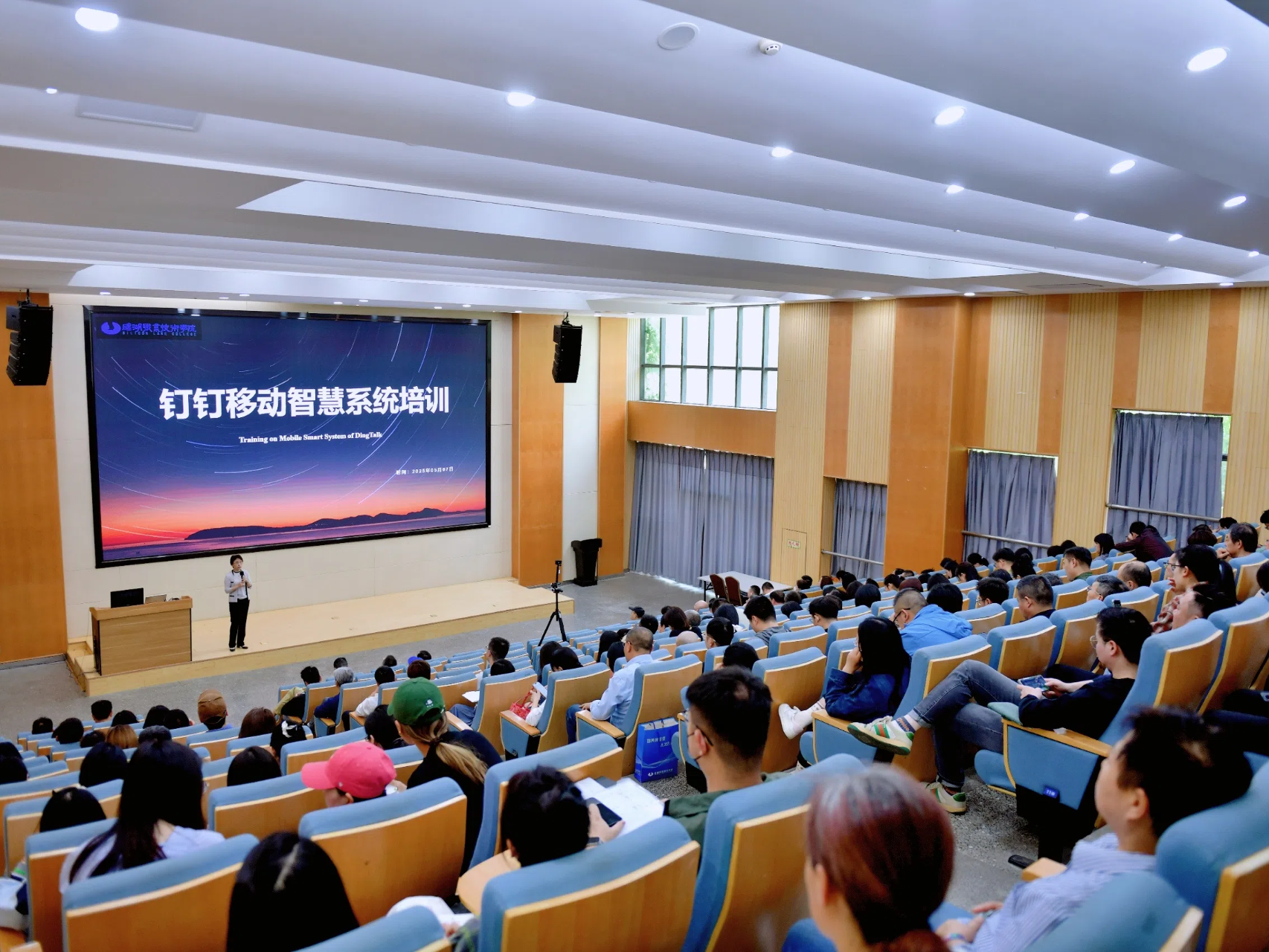 为深化教育数字化转型,提升校园管理效能,5月7日13:30至15:00,硅湖学院在育才楼104报告厅举行钉钉移动智慧系统专题培训,全体教职工参与学习。本次活动由教师发展中心屈赛英主任主持,钉钉资深服务专家崔斌斌经理担任主讲,执行校长曾勇勤博士出席并作动员讲话。