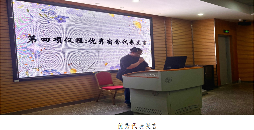 开幕式上,2024级蒋淑婷同学作为第四届优秀宿舍2417宿舍代表发言。她分享道,从注重内务整洁到共同制定宿舍公约,获评优秀宿舍的历程离不开舍友齐心协力,让宿舍成为了意义非凡的“第二个家”。随后,裁判代表谢中霞同学庄严宣誓,承诺全体裁判将严守规则、秉持公正,从卫生、制度、文化等多维度全面评判,主动接受师生监督,尊重每间宿舍的辛勤付出。