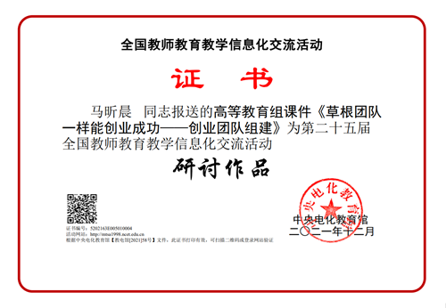 其中,马昕晨老师报送的课件《草根团队一样能创业成功——创业团队组建》,以小程序的形式呈现,通过党史提炼出创业团队组建的四大要点,符合创业类课程内容的要求,体现课程思政,有助于提高学生创业和思政教育水平,被评为第二十五届全国教师教育教学信息化交流活动研讨作品。