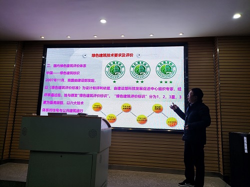 2022年12月7日下午,由建筑与环境工程学院承办的生态文明讲座在育才楼102阶梯教室成功举办。此次讲座邀请了苏州某建筑公司项目总工、项目经理、公司技术部经理、总工程师张绪坤为同学们做题为“绿色建筑与绿色施工”的讲座。