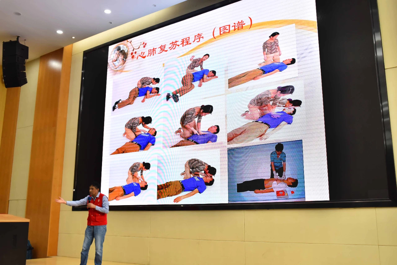 昆山市中西医结合医院张士忠医生对日常生活中急救的重要性和“心肺复苏”、气道异物梗阻现场救护、创伤救护等急救方法进行了详细讲解和现场示范。
